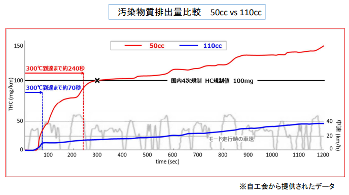 50ccのエンジンでは、触媒の浄化が始まるまで時間がかかり過ぎ、新規制値に近い大気汚染物質が出てしまうため、第4次排ガス規制に対応することができない。